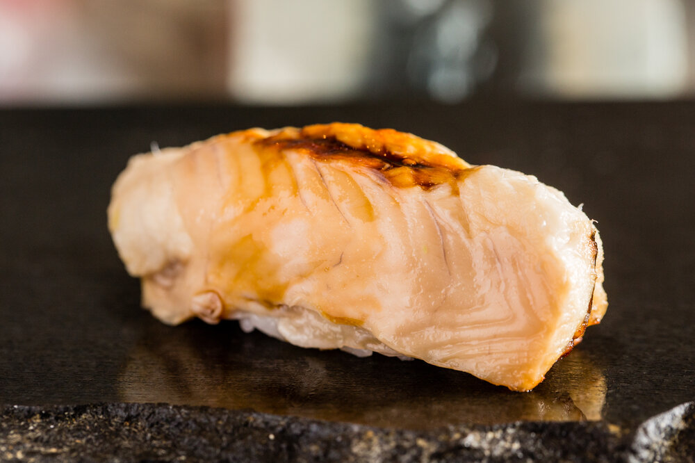 Halibut sushi. Imported from all over the world. During the winter a half pound halibut is recommended while a 1 pound size would be better off season. Hirame is a common nigiri you can find at many sushi restaurants. You must eat at the bar for omakase.