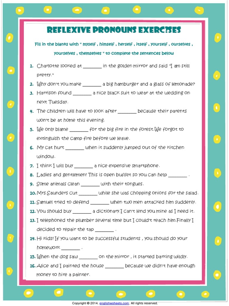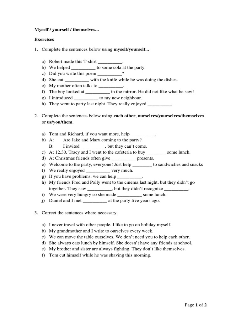 Myself yourself himself exercises pdf. Practise your english grammar in the english classroom. Tom saw a reflection of himself in the mirror. Emma was sitting by herself. Myself yourself himself herself itself ourselves yourselves themselves.